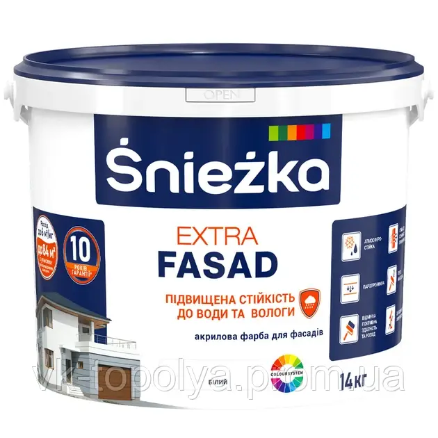Фарба Sniezka Екстра Фасад – це високоякісна акрилова емульсійна фарба, призначена для фарбування фасадів та зовнішніх стін. Вона забезпечує надійний захист від атмосферних впливів та має підвищену стійкість до води і вологи. Фарба має відмінну покривну здатність, що дозволяє економно використовувати матеріал. Завдяки своїй паропроникності, вона дозволяє стінам “дихати”, запобігаючи утворенню конденсату.